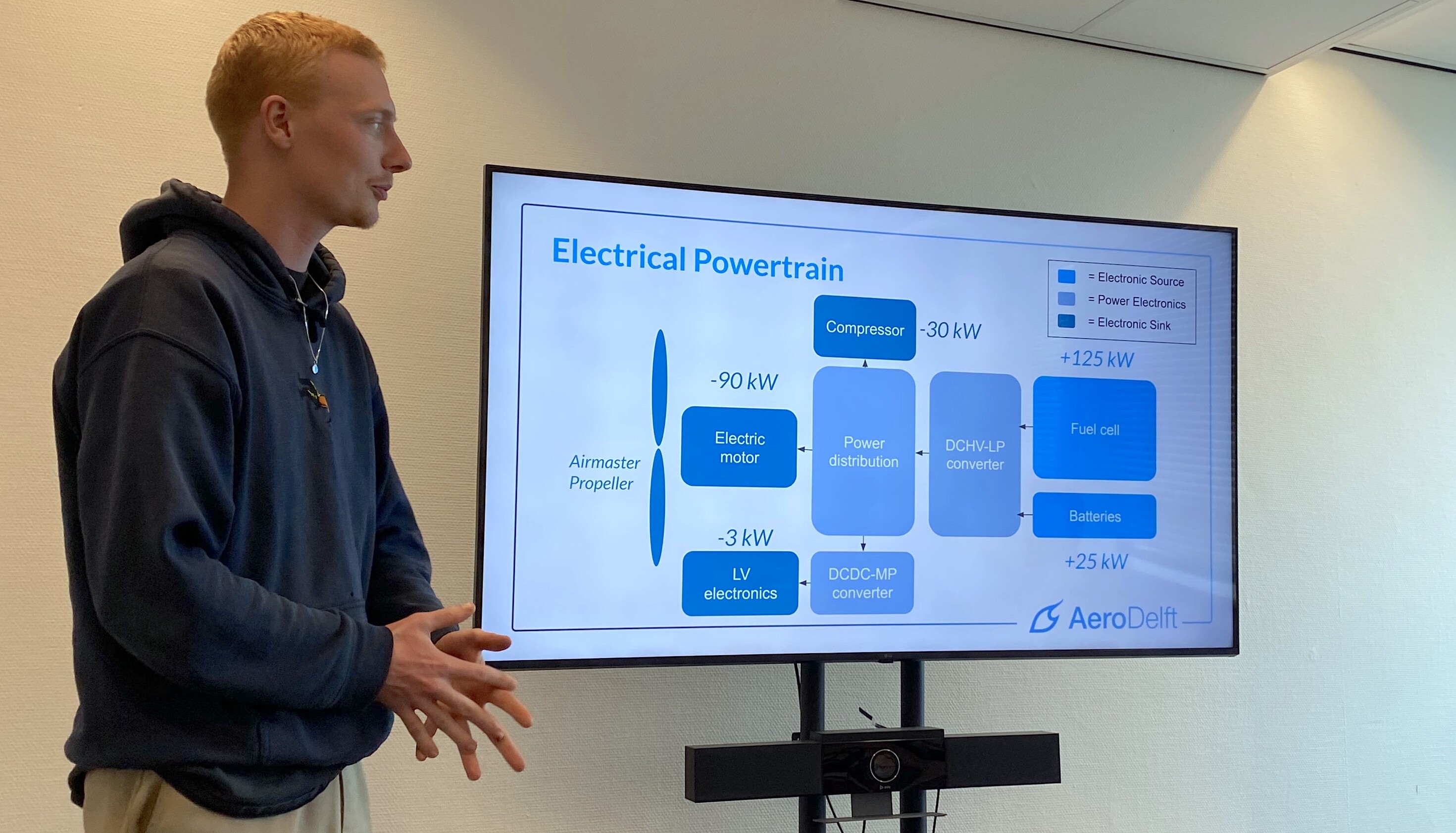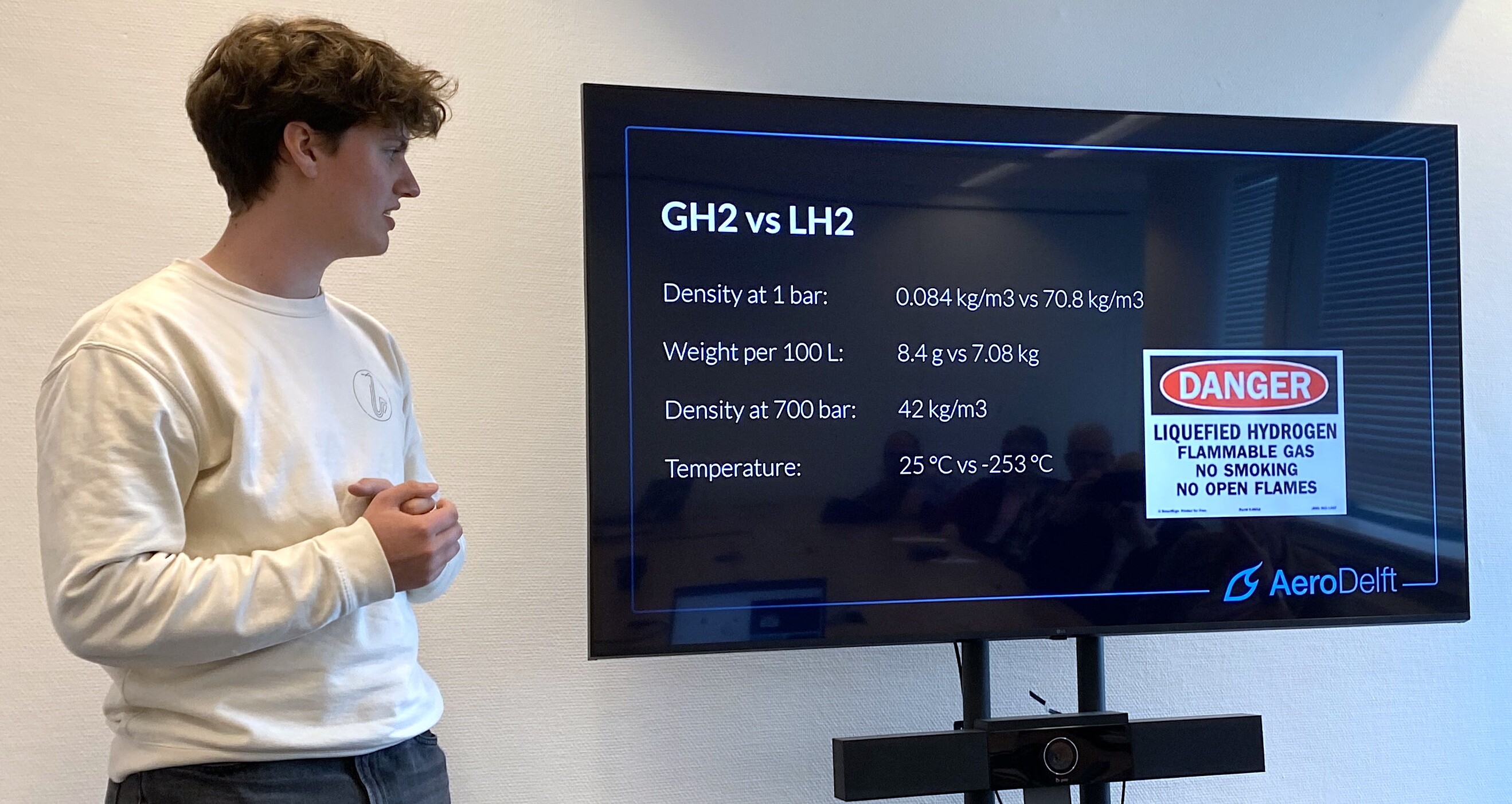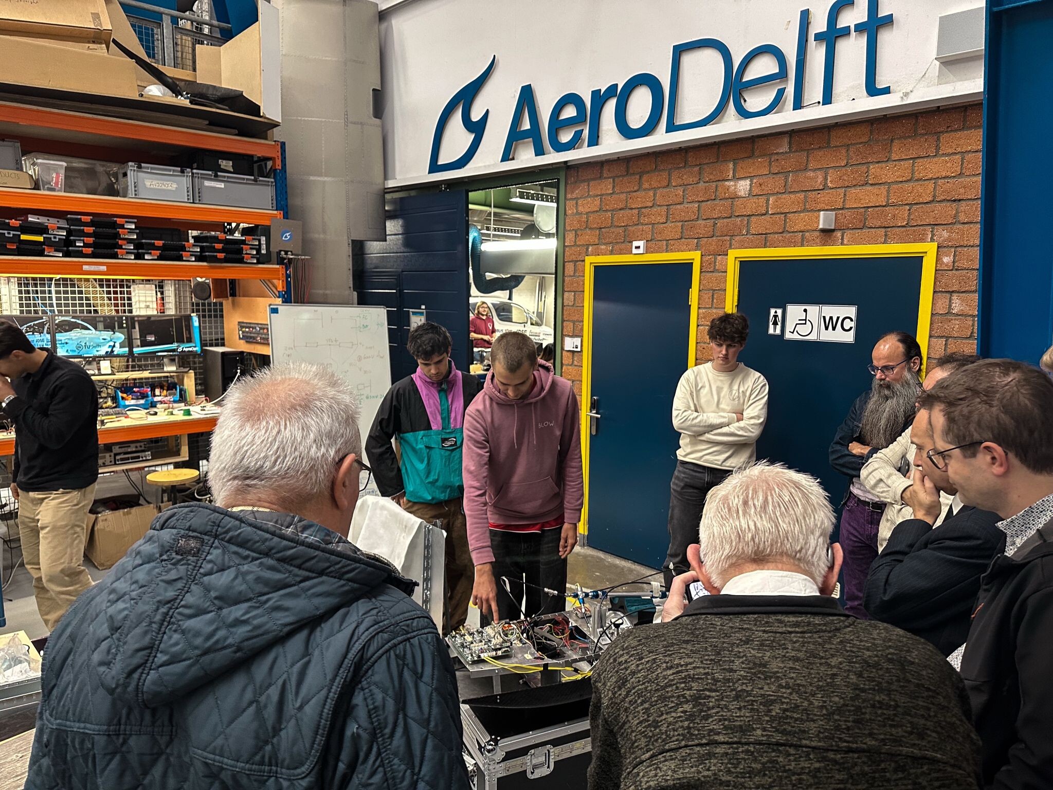 Op de 14e verdieping van de faculteit Lucht en Ruimtevaart werden we warm ontvangen door Tycho Gunter. Hij vertelde dat AeroDelft jaarlijks uit 50 nieuwe studenten bestaat, in het gebouw zit van de TU Delft, en in principe onafhankelijk werkt. Er is een indrukwekkende lijst met partnerbedrijven en onderzoeksinstellingen. Het doel is om het eerste volledig op waterstof aangedreven vliegtuig in de lucht te krijgen. Bart Meenderman lichtte toe dat AeroSpace Innovation Hub @TU Delft partner is in AeroDelft en schetste de context.