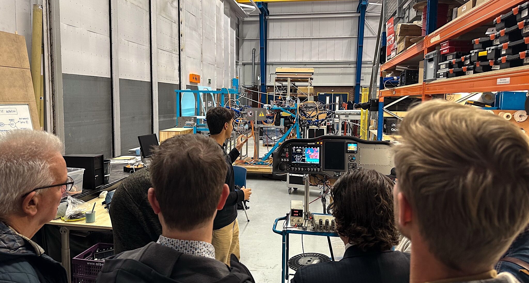 Nu volgde een bezoek aan het R&D lab. Van de belangrijkste onderdelen staan er werkende prototypes. Het vliegtuigje staat 1-op-1 te wachten in onderdelen voor gebruik. Van het vloeibare waterstoftankprincipe is een werkend schaalmodel gemaakt en succesvol getest op 9 mei dit jaar. De electromotor is ingekocht en staat klaar om ingebouwd te worden. De brandstofcel is ontworpen en gemaakt. Van de constructie zijn prototypes gemaakt en getest. Van de user interface wordt een prototype gemaakt en getest in het werkende vliegtuigje. Van de andere electrische onderdelen en (hogedruk) aansluitingen worden de onderdelen gemaakt en tegest. In de R&D hal zitten constant zo’n 8 tot 10 studenten tegelijk te werken. Echt een indrukwekkende teaminspanning.