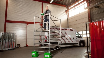 De steigermover is ontwikkeld door J. Blom Opmeer B.V. Om met een kamersteiger veilig en verantwoord te werken moet deze op de rem staan. Doordat de monteurs op de steiger snel willen werken “vergeten” ze dit wel eens? Dit heeft tot gevolg dat het Ministerie van Sociale Zaken en Werkgelegenheid (SZW arbeidsinspectie) de controles flink opvoeren sinds 2013. Deze inspecties resulteren in stevige boetes voor zowel de werkgever als werknemer. Er moet dus veilig en snel worden gewerkt. Afstappen, van de rem, verplaatsen, op de rem en klimmen is met de Steigermover verleden tijd. (fotografie: Jorrit 't Hoen)
