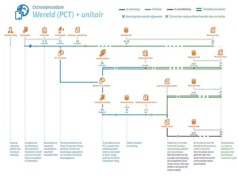 octrooiaanvraagprocedure wilt doorzetten. Je hebt vanaf dat moment alleen nog te maken met de nationale octrooibureaus. De PCT-procedure loopt via de World Intellectual Property Organization (WIPO). Het kost tussen € 10.000 en € 15.000. Dit dekt de kosten voor de internationale aanvraag en de octrooigemachtigde. Daar komen later (na dertig maanden) de kosten voor de nationale en regionale procedures nog bij, en de kosten voor instandhouding. Deze kosten hangen sterk af van je landenkeuze bij afloop van de PCT-procedure. In de afbeelding hiernaast is ervoor gekozen om vanuit de Nederlandse aanvraag uit te breiden naar de PCT-procedure binnen het prioriteitsjaar.