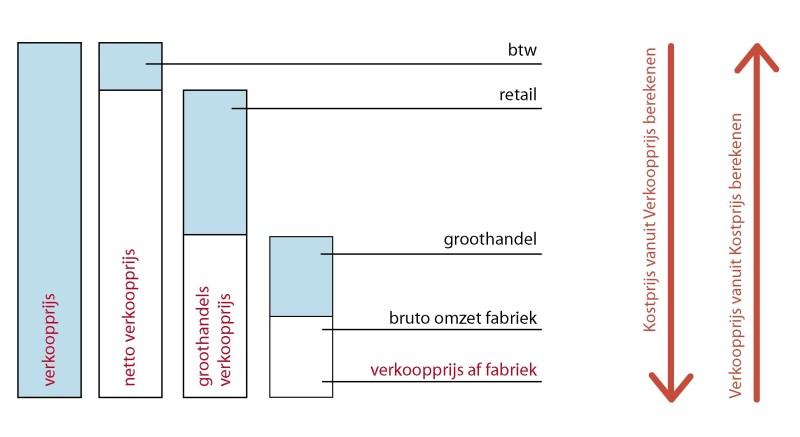 Bij methode 1 bereken je eerst de kostprijs van je product. Als je niet zelf produceert kun je via offertes een beeld krijgen van de kostprijs. Analyseer de opbouw van de offertes; zij geven inzicht in de opbouw van de kostprijs. Vanuit de kostprijs rekent je per tussenschakel een bepaalde opslag (de detailhandel rekent tussen de 20 en 300 % opslag, afhankelijk van de branche en de consument betaalt nog 19 % BTW).