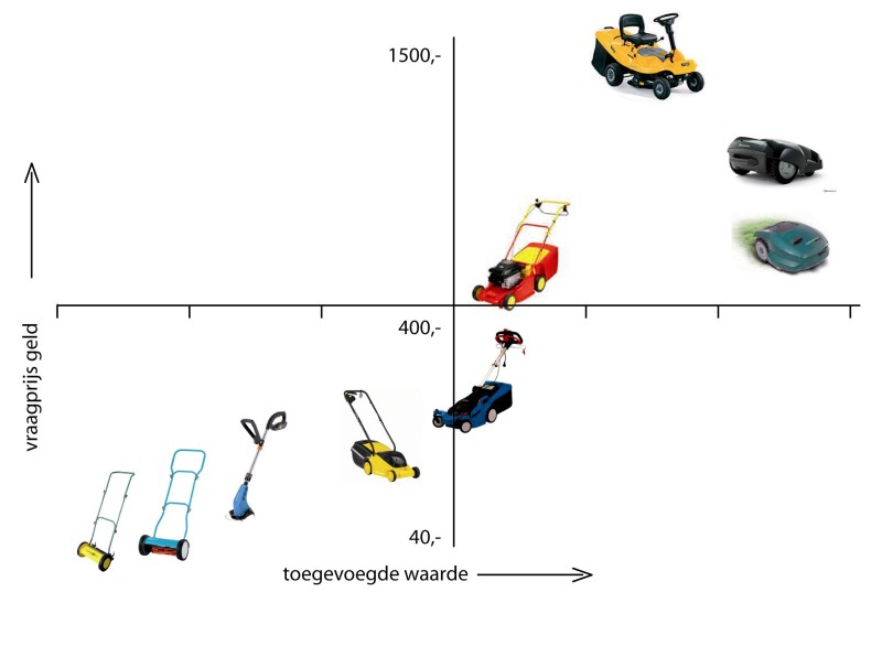 In dit diagram kun je ook de marktpositie van die artikelen vergelijken met de positie die bij je vinding hoort. Zo krijg je een globaal inzicht in wat een acceptabele verkoopprijs is.
