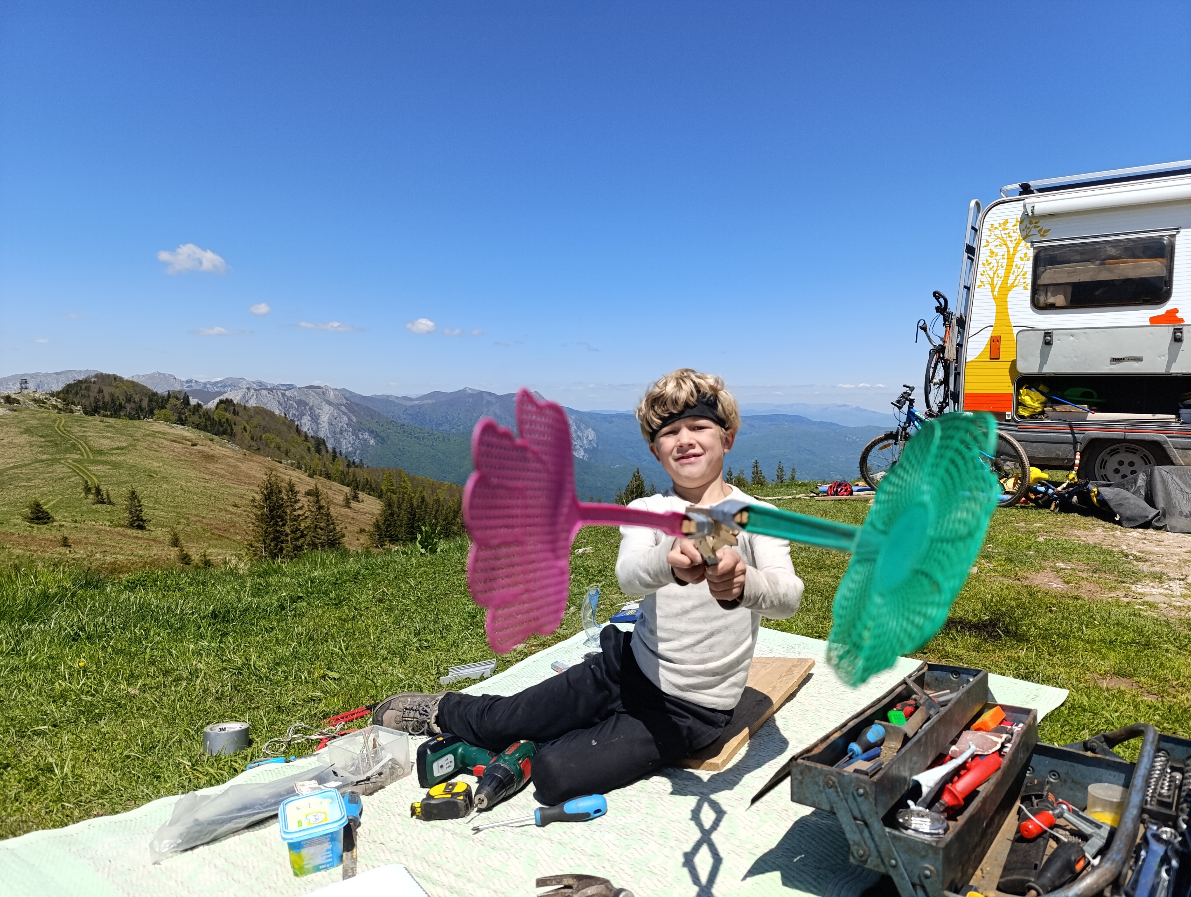 Al reizende is De Vliegenknijper bedacht. ,,Ik ben zomaar wat gaan tekenen. Na een kwartiertje ofzo stond De Vliegenknijper op papier. Daarna heb ik ‘m met papa in elkaar gezet. Of we veel last hadden van vliegen in de camper? Die hadden we in het begin van onze reis, in Italië en in Slovenië. Ik denk niet dat er een direct verband is tussen die vliegenplaag en mijn uitvinding. Er zit nogal wat tijd tussen.”