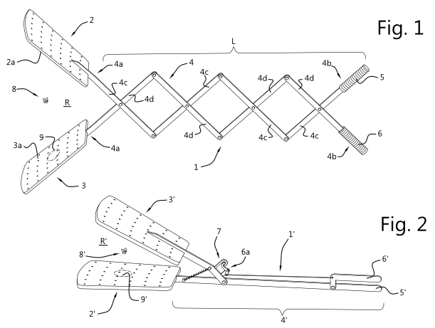 Figuren 1 toont De Vliegenknijper, zoals voorgesteld door Dax. Figuur 2 toont een geopperde variant, die het nadeel van het van de gebruiker af bewegen van de mepperbladen niet heeft, en door het doen ontspannen van een veer ook een grotere mepsnelheid mogelijk maakt. Tekeningen Tony ter Horst