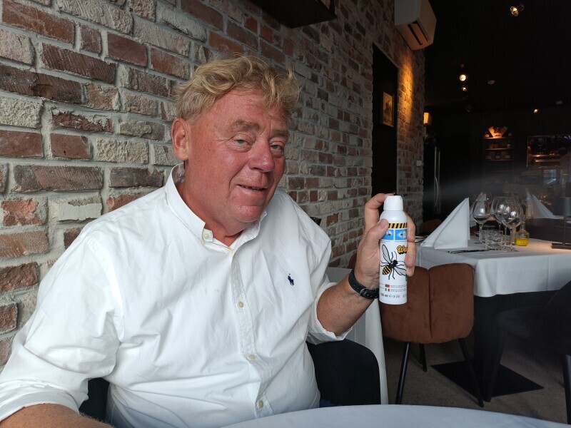 Zijn laatste ontdekking, een diervriendelijke wespenverjager, zou weleens tot een kaskraker kunnen uitgroeien. ,,Van 10 tot 100 jaar, iedereen heeft in meer of mindere mate een hekel aan wespen. Ikzelf heb een grondige hekel aan wespen. Ik moet het beter zeggen. Ik ben doodsbang voor wespen. Tijdens een vakantie in Frankrijk spoot ik, panisch dat ik voor deze insecten ben, min of meer uit een reflex met een waterverstuiver richting een wesp die in mijn buurt dreigde te komen. Door die nevel, die in je gezicht een verkoelend effect geeft, vloog de wesp weg. De wesp erna deed hetzelfde. De vakantie ging voorbij, en daarmee het wespenseizoen. Tot we het jaar erop weer in Frankrijk waren, en er weer wespen om me heen vlogen. Wederom vlogen ze een bepaalde kant op als ik met die spray een wolkje nevel spoot. Ik ben vervolgens gaan kijken waarnaartoe de wespen vlogen. Ze gingen terug naar hun nest. Da’s interessant, dacht ik. Ik moet hier iets mee.”